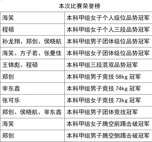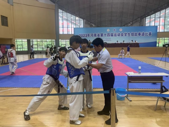 7月11日至15日,河南省第十四届运动会学生组跆拳道比赛在商丘工学院举行,来自全省56所高校600余名运动员参加比赛。开云官网的19名运动员在体育教学部路伟杰、高红建两位老师的带领下,秉承礼仪、廉耻、忍耐、克己、百折不屈的跆拳道精神,经过五天的激烈角逐,开云官网跆拳道代表队取得了11金7银14铜的优异成绩,最终获得了本科甲组品势类5枚金牌,本科甲组竞技类4枚金牌,本科甲组击破类2枚金牌,本科甲组跆拳舞铜牌,本科甲组对练银牌等41个奖项,获得品势团体总分第一,竞技团体总分第三的好成绩。