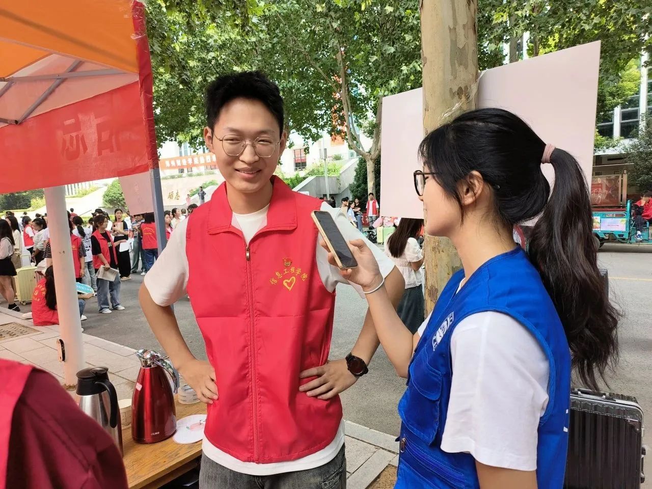 来自校卫队的志愿者韩冰茹是商学院的一名大二学生,她身穿红马甲,手持校园地图穿梭在迎新“第一线”,她的职责是为刚进校门的新生们指引报到流程,及时疏散聚集人群等,让迎新现场更加有序。“最大的感触就是时间飞逝,转眼间我已经上大二了,看到了大一的同学仿佛看到了之前的自己。今年的我作为志愿者为新生服务,不仅锻炼了我的沟通能力,也能为学校出一份力,感到非常荣幸。”韩冰茹在工作间隙回答道,“在今天的迎新现场,我们见到了许多朝气蓬勃的新同学,希望他们能够在今后的学习生涯中不断进取,开心度过这段青春、活力满满的大学生活。”