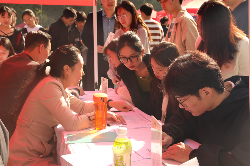 双选会现场气氛热烈,各企业招聘展台人头攒动、排起长龙,供需双方“双向奔赴”,就工作内容、岗位职责、发展前景、薪资待遇等交流洽谈。