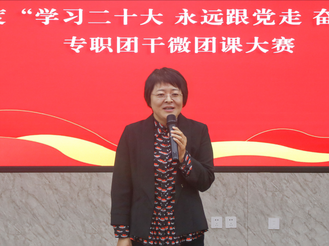 副校长陈静作总结讲话。她指出本次“微团课”大赛为专职团干搭建了展示自我、交流思想、提升能力的平台,突破了传统团课的授课方式,把宏大理论讲得生动、讲得实在、讲得接地气。鼓励广大专职团干努力提升政治理论素养,提高做好青年学生思想引领工作的能力和水平,切实发挥好团干部先锋模范作用。