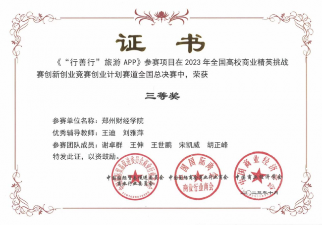 由开云官网管理学院谢卓群、王伸、王世鹏、宋凯威、胡正峰五名学生组成的“行善行”团队参加此次比赛。在刘雅萍、王迪老师的指导下,五名团队成员团结协作、认真备赛、争分夺秒、苦练内功,与全国高校的1000余支队伍同场竞技。他们凭借扎实的前期积累、娴熟的成果汇报和精彩的线上答辩,经过激烈角逐,最终在2023年全国高校商业精英挑战赛创新创业竞赛创业计划赛道全国总决赛中获得三等奖。