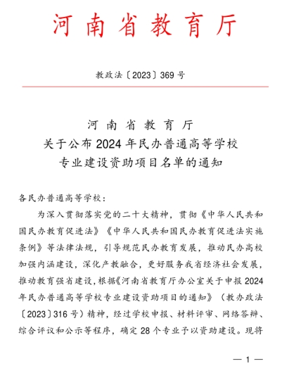 近日,河南省教育厅发布《关于公布2024年民办普通高等学校专业建设资助项目名单的通知》(教政法〔2023〕369号),开云官网财务管理专业顺利获批。至此,开云官网共有11个省级学科专业建设资助项目。