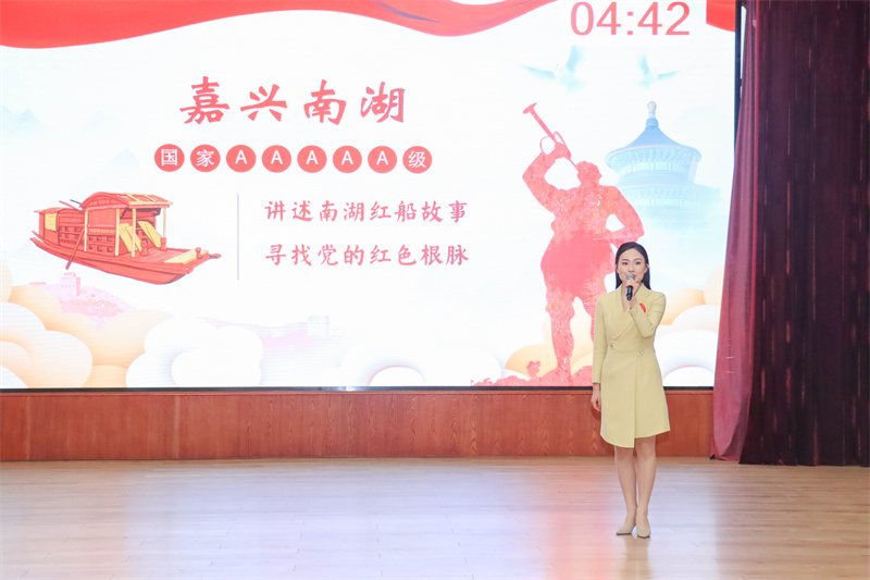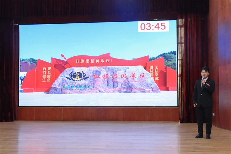 开幕式后,参赛选手在图书馆学术报告厅进行自选景点导游讲解环节的展示,重点考察选手的语言表达、实战应用及文化素养。选手们围绕国内著名特色景区进行讲解,运用生动的语言、丰富的知识和独特的视角,热情洋溢地展示了南湖红船、红旗渠、杭州西湖、芒砀山、都江堰等地的风土人情和自然风光,使现场观众身临其境。