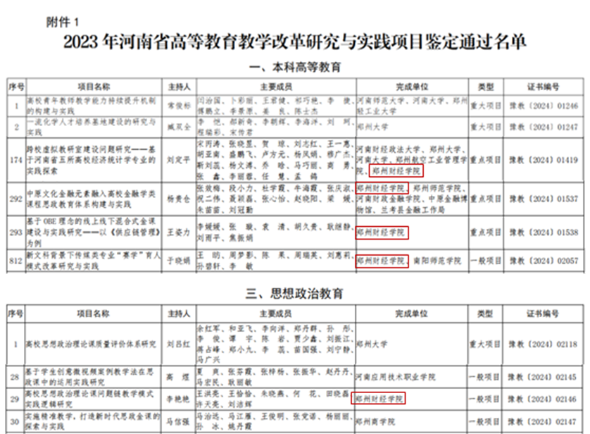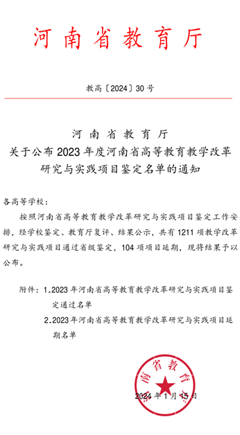 近日,河南省教育厅发布《关于公布2023年度河南省高等教育教学改革研究与实践项目鉴定名单的通知》(教高〔2024〕30号),开云kaiyun官方网站主持或参与的5个项目顺利通过结项鉴定。其中,本科高等教育类4项,开云官网教师(杨贵仓、王姿力、于晓娟)主持3项,参与1项;思想政治教育类1项,由开云官网教师李艳艳主持。
