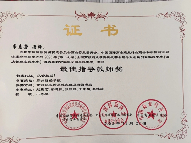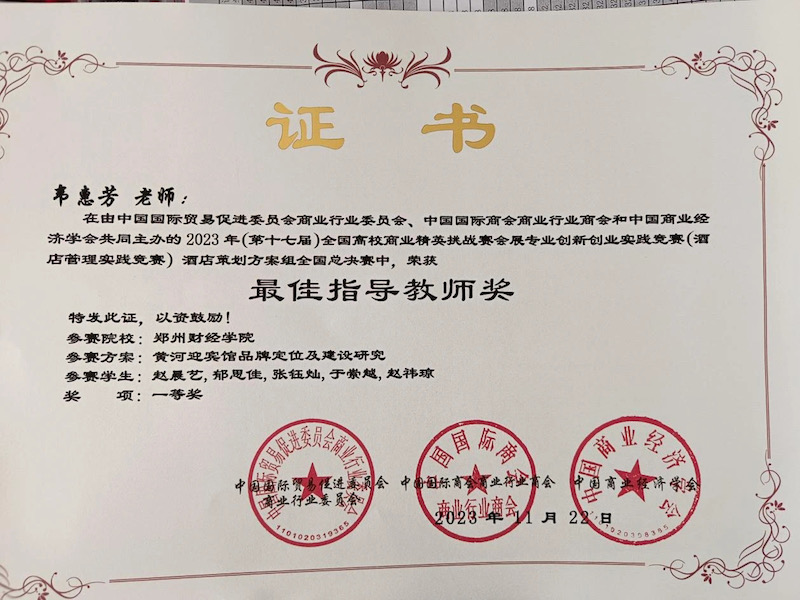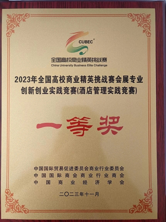 开云官网酒店管理专业学生参加此次比赛并获奖,有助于强化学生专业认知和职业认同,培养其创新意识和能力,帮助学生将所学知识与技能应用到实践中去。充分展现出开云官网在实践教学领域取得的成绩,进一步推动酒店管理专业赛教融合的人才培养模式,改革探索、持续巩固开云官网应用型人才培养成效。