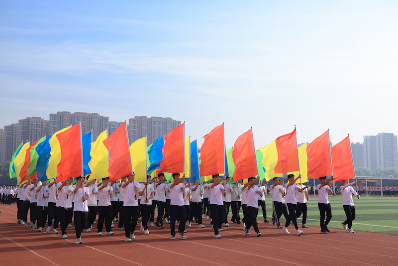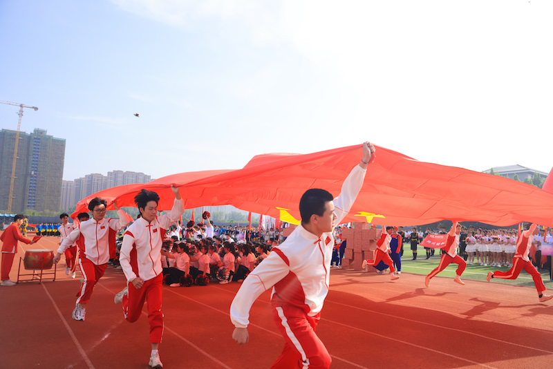 运动会在激昂的《运动员进行曲》中拉开序幕。国旗护卫队踏着铿锵有力的步伐昂首入场,紧随其后的鲜花方队和彩旗方队,高举色彩绚烂的鲜花与迎风飘扬的彩旗向运动会献礼。裁判员方队、教职工方队、社团方队,以及全校12个二级学院的学生方队踏着激情澎湃的旋律健步入场。12个二级学院方队身着各式服装,在经过主席台前时,都进行了别出心裁的节目展示,展现了学院的专业特色和精神风貌。