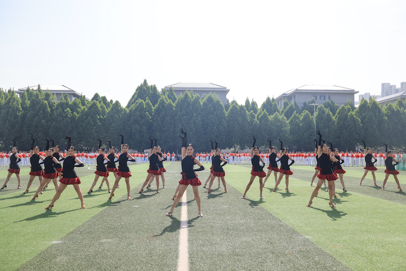 各学院方队退场,汇报表演开始。由二级学院1000名学生和校运动队140名运动员组成的大型团体操表演《青春与梦想》,分三个乐章进行表演。第一乐章:“龙”重登场。《精忠报国》音乐响起,400名同学手持金龙,奔向场地中央,音乐在跳动,青春在飞扬。第二乐章:未来有你。600名同学手持花球,她们步履轻盈,散发青春的芬芳。她们譬如朝阳,舞动青春的臂膀。第三乐章:春暖花开。表演者们在方寸之间绽放青春活力,律动之间升华郑财精神。