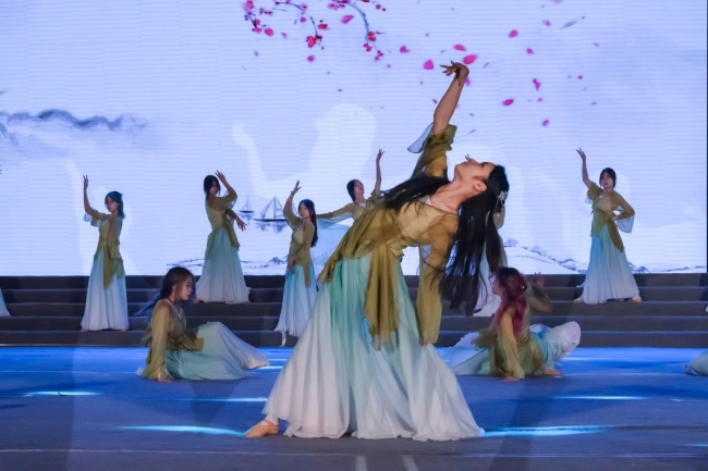 《一曲惊鸿》表演者身着秀青的舞衣,同背景山水画相呼应,随着音乐响起,展示出一系列旋转、展臂、抖抛水袖等优美的舞蹈动作,以青春之舞姿舞动青春之山河。