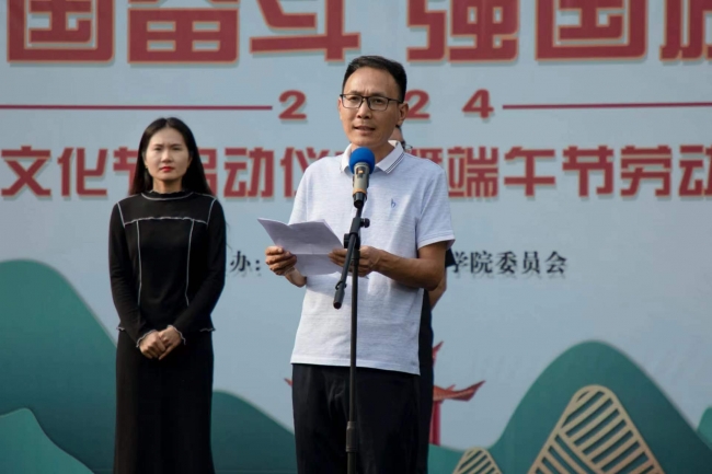 校团委书记周二涛致辞。他首先诚挚地向筹备本次活动的全体工作人员以及师生表达感谢。指出高校作为传承中华文化的重要阵地,肩负着向学生传承中华文化的重任。同时提出三点希望:一是深刻理解,涵养爱国情怀;二是精心组织,打造品牌活动;三是踊跃参与,营造浓厚氛围。他强调,应以此次端午劳动教育和传统文化节为契机,坚守立德树人初心,借丰富的活动形式扎实推进劳动教育工作,引导学生在活动中增强对传统文化的认同感。