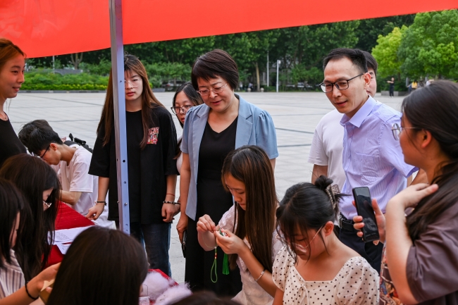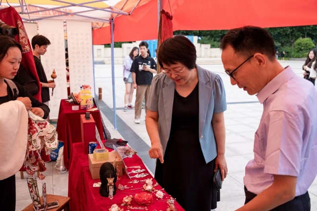 副校长陈静、校团委书记周二涛参观社团传统文化创意展品