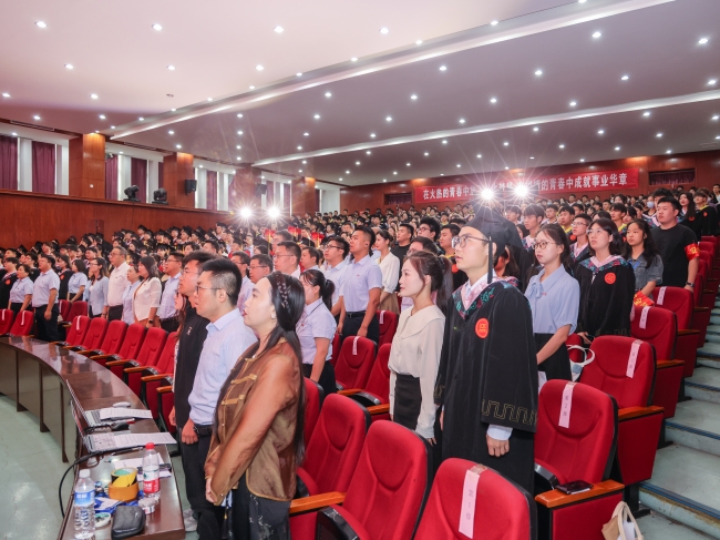 伴随着歌曲《一路生花》,2024届学生毕业典礼暨学位授予仪式正式拉开帷幕。典礼进行第一项,全体起立,奏唱国歌。