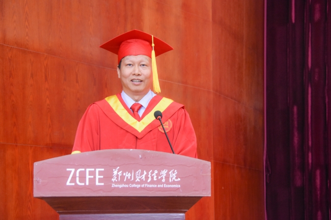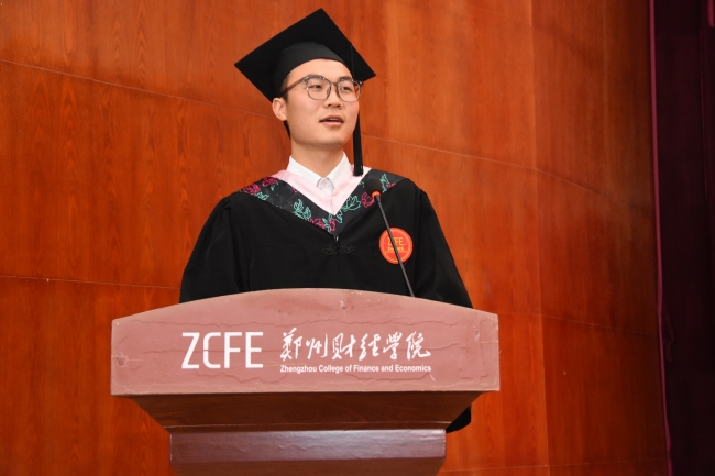 毕业生代表会计学院2020级财务管理本科1班贾成旭同学发言。他代表毕业生们表示愿铿锵前行,砥砺奋进路,展望新程,整装待出发。走出校门后,以更加从容的心态和坚定的自信,践行“厚德、砺志、笃学、敏行”的校训,怀抱梦想又脚踏实地,敢想敢为又善作善成,在拼搏的青春中成就人生华章。
