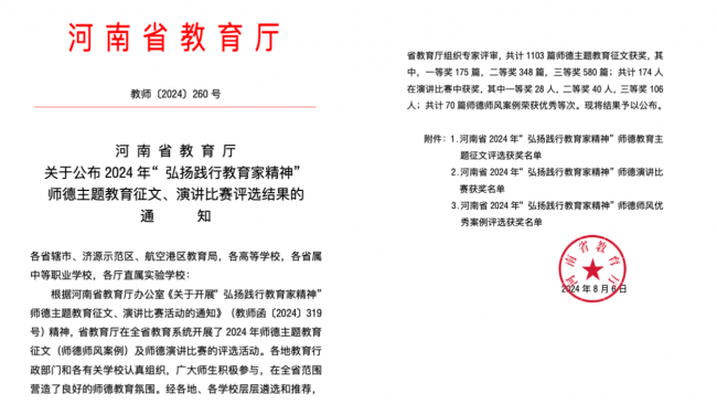 近日,河南省教育厅发布《关于公布 2024 年“弘扬践行教育家精神”师德主题教育征文、演讲比赛评选结果的通知》(教师〔2024〕260 号),开云官网喜获佳绩,荣获师德主题教育征文一等奖1名、二等奖2名、三等奖3名。