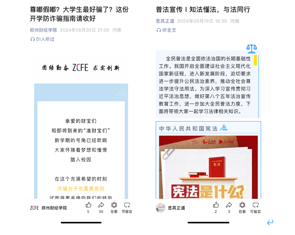 各二级学院不断加强网络宣传,在入脑入心上下功夫,通过微信公众号发布相关推文,普及法律知识,营造浓厚氛围,确保法治宣传教育取得实效。