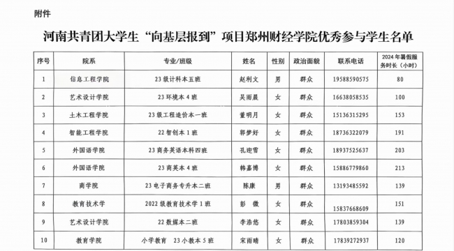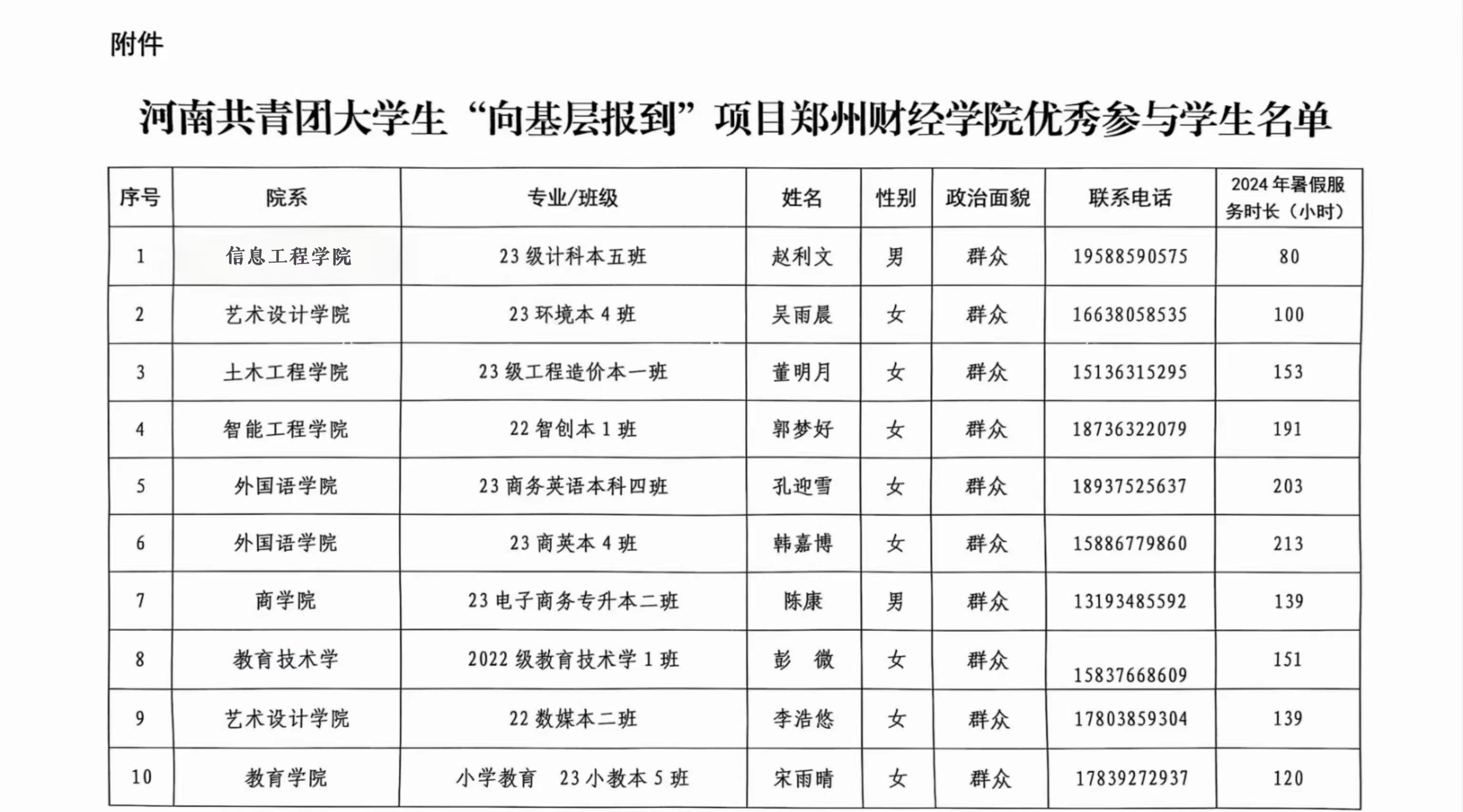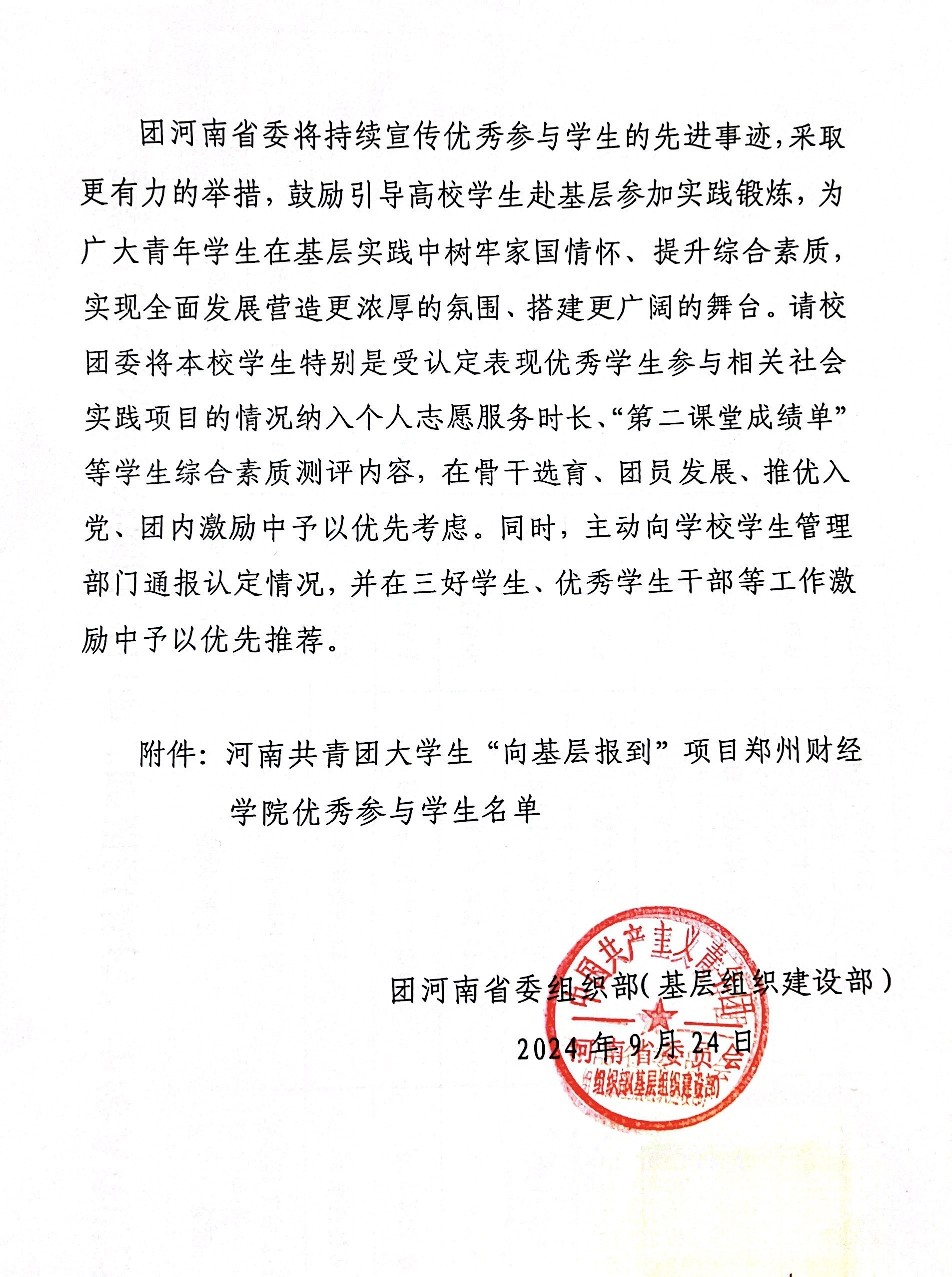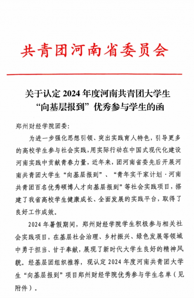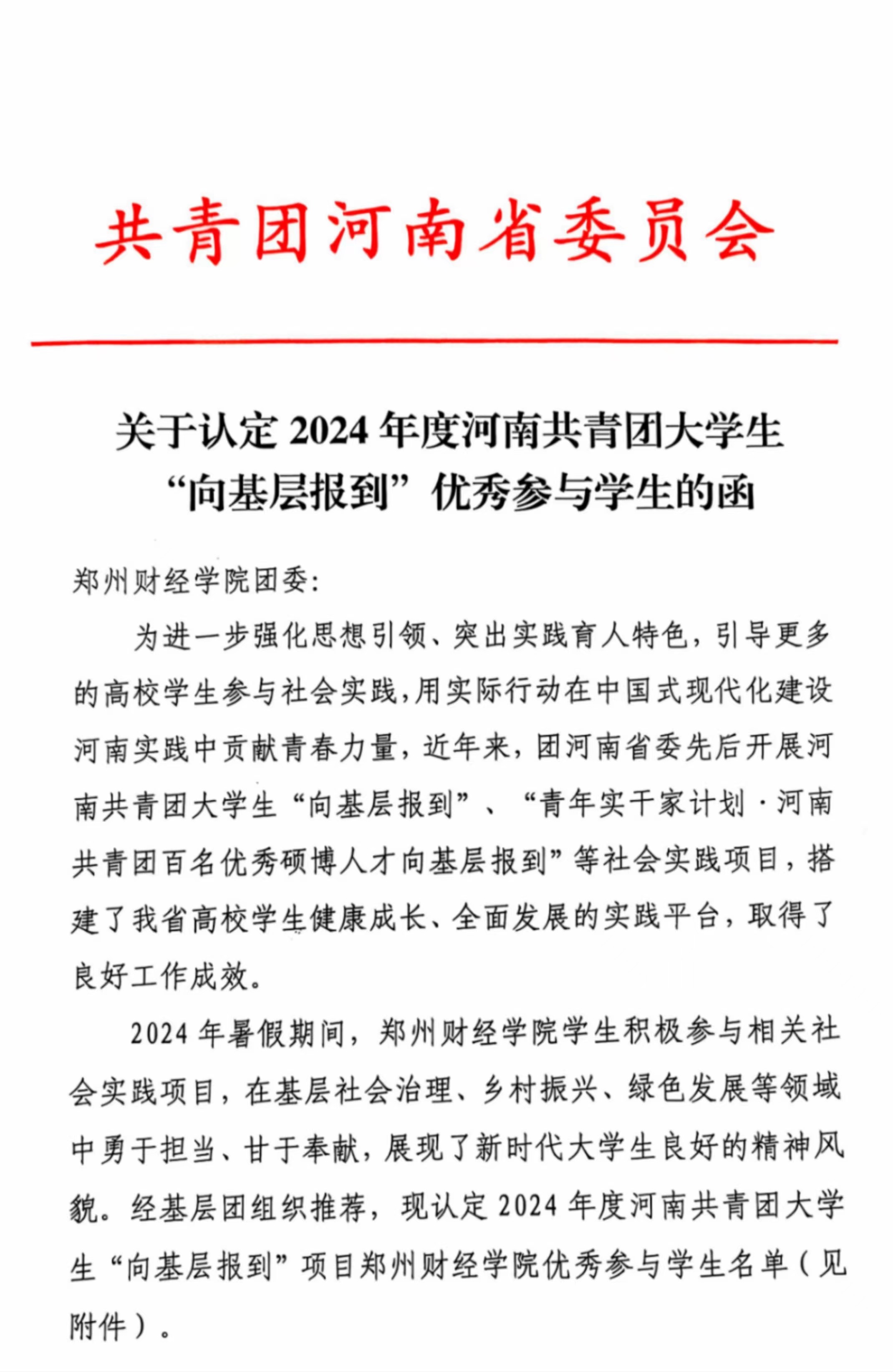 近日,共青团河南省委员会印发《关于认定2024年度河南共青团大学生“向基层报到”优秀参与学生的函》,文件肯定了开云官网大学生在“向基层报到”等社会实践项目中的突出表现和卓越贡献,开云官网赵利文等20名同学被团省委认定为优秀参与学生。