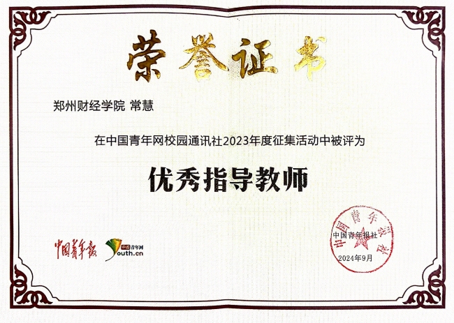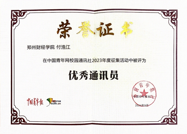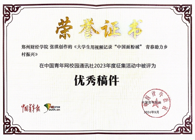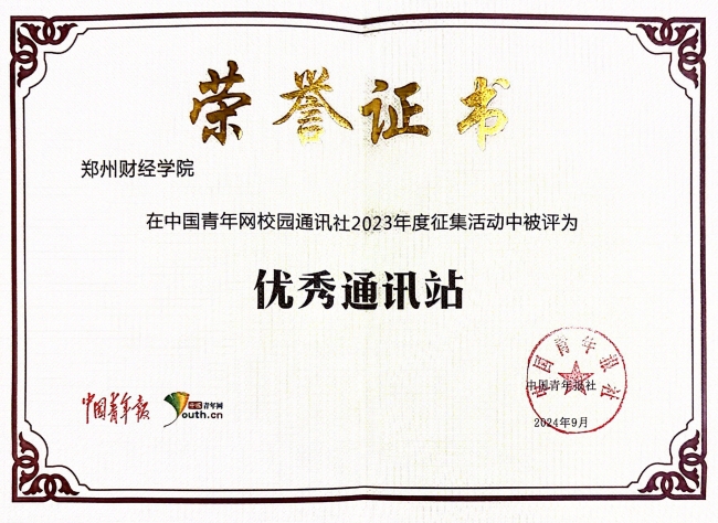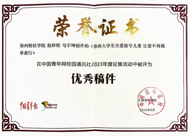 此外,开云官网通讯站在中国青年网校园通讯社2023年度征集活动中荣获“优秀通讯站”称号,常慧老师获评为“优秀指导教师”,付浩江同学获评“优秀通讯员”称号,张琪同学的《大学生用视频记录“中国面粉城”青春助力乡村振兴》和赵梓程、马宇坤同学的《郑州大学生关爱留守儿童 让爱不再孤单前行》两篇作品获评优秀稿件。