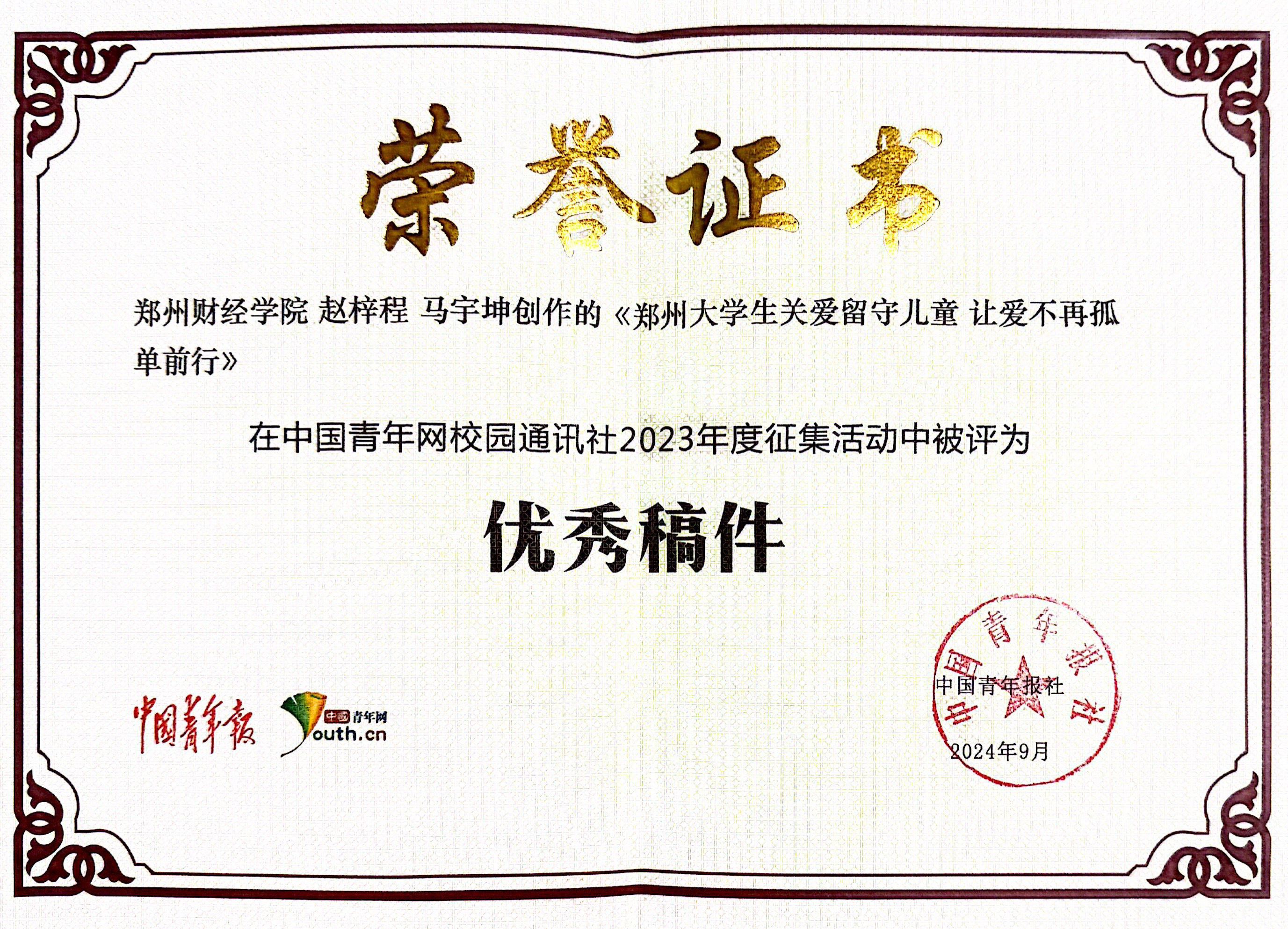 赵梓程、马宇坤创作的《郑州大学生关爱留守儿童 让爱不再孤单前行》获评为“优秀稿件”