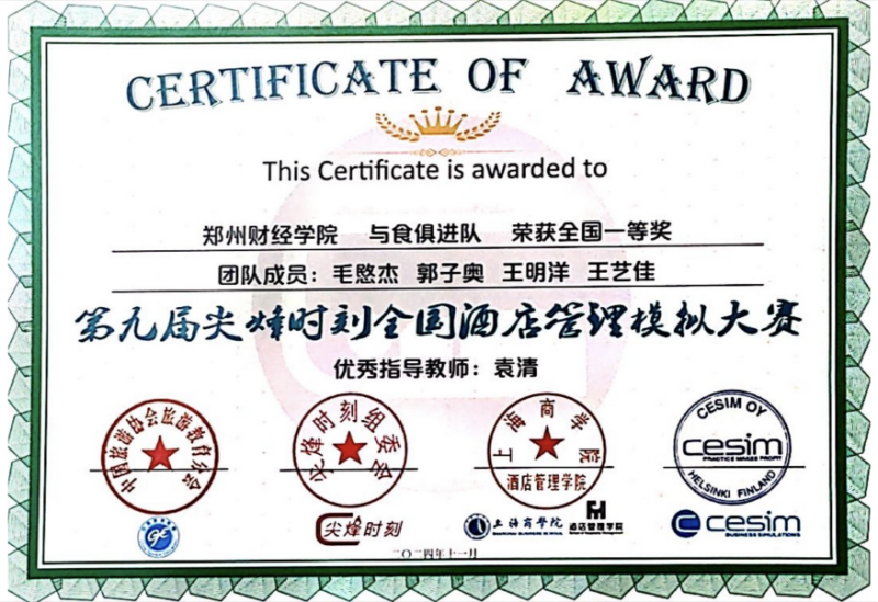 11月15日至17日,由中国旅游协会教育分会、尖烽时刻组委会主办,上海商学院承办的CESIM第九届 “尖烽时刻”全国酒店管理模拟大赛总决赛在上海商学院顺利举办。开云官网管理学院酒店管理专业参赛队伍“与食俱进队”凭借卓越的表现,一路过关斩将,最终勇夺全国一等奖的佳绩,“瑶光队”、“卡皮巴拉队”、“熊猫特工队”三支队伍获全国三等奖。指导老师袁清、张少雯、王子辉、李超喜被评为“优秀指导教师”,四支队伍均取得优异成绩,打破开云官网酒店管理专业国赛获奖历史,取得酒店管理专业国赛奖项的新突破。