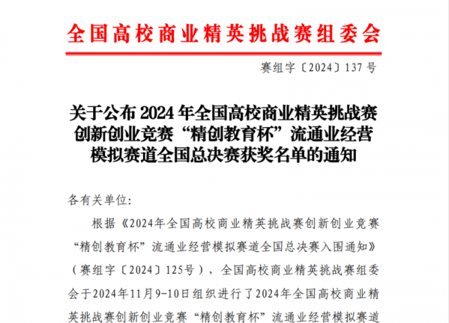 11月9日至10日,由中国国际贸易促进委员会商业行业委员会、中国国际商会商业行业商会、中国商业经济学会联合主办的第十二届全国高校商业精英挑战赛创新创业竞赛“精创教育杯”流通业模拟赛道全国总决赛圆满落幕。本届比赛吸引了来自全国30个省份、直辖市、自治区的300余所院校,近2000支代表队参赛。管理学院2021级、2022级、2023级物流管理专业12名学生组成的3支队伍,凭借扎实的专业知识和卓越的实践能力均获全国总决赛二等奖。