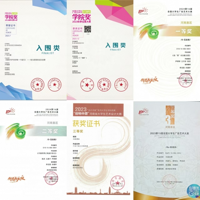 毋庸置疑,每一项成绩的取得必定都是辛勤耕耘的结果。2024年参与的大广赛H5赛道给尹婷婷留下深刻印象,白天一边上课一边彩排,还要自学一些技术,晚上熬夜做作品,怀着“哪怕就只有一个人能体会到作品传达的内容,那我的目的就达到了”的热忱继续前行。忙而不盲,分轻重,为各项任务列主次并且有条不紊地进行。她说,在遇到困难想放弃的时候,想一想自己为什么会选择做这件事,想一想自己是否已经做到了极限,要记得,过程永远比结果有意义。“只要热爱,山海皆可平,无处不是风景”的信念支撑着她,跨越重重关卡,在竞技赛场上追梦逐梦。