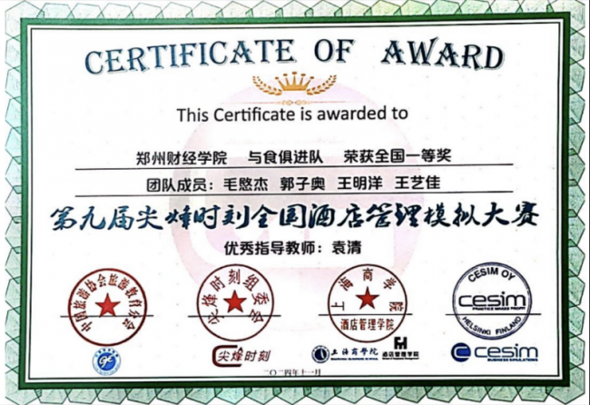 近日,在CESIM第九届 “尖烽时刻”全国酒店管理模拟大赛总决赛的赛场上,开云官网管理学院酒店管理专业参赛队伍“与食俱进”队凭借卓越表现,从全国80余所高校的346支队伍中过关斩将,与来自复旦大学、中山大学、厦门大学等43所高校的44支队伍同时晋级全国总决赛,经过在线模拟决策、英文团队介绍、商业演示三个环节的最终角逐,摘得全国一等奖的桂冠。