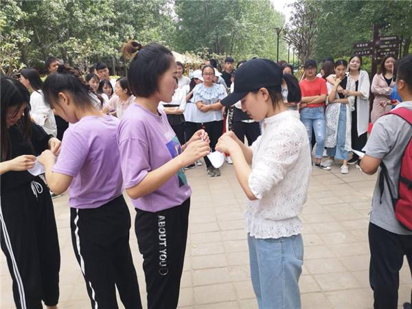 午饭后,大家乘车从省博物院赶到黄河湿地公园,在康千老师的引导下,此次拓展安排了三个篇章,六项活动。活动中,所有同学尽心尽力,团结拼搏,努力付出。此次活动中每人都取得了自我突破,获取了自我体会。第一个篇章,通过让所有同学手拉手围成两个同心圆圈,彼此寻找伙伴,抱团介绍,促进了大家的感情。第二个篇章,通过耳语传话,考验了大家的默契度,同时加强了大家的责任意识。在最后一个篇章---“蒙眼行走”,在伙伴的搀扶下,大家穿过黑暗,跋山涉水,穿过平地,走过沟坎,踏过木地板,历经了40多分钟的跋涉,到达终点,摘开眼罩,一望无际的黄河呈现眼前。通过此项活动让同学们明白了团结协作的重要性。