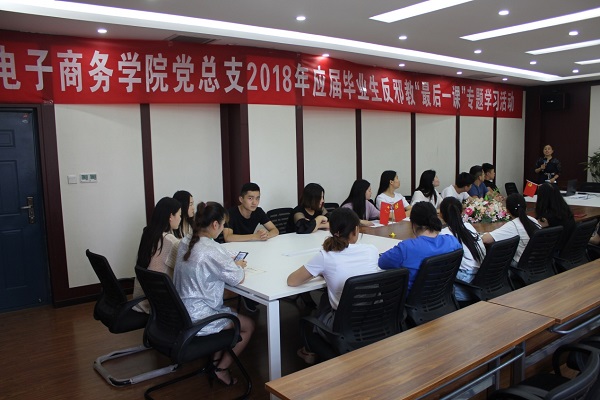 为进一步扎实推进反邪教教育宣传工作,增强应届毕业生对邪教组织的鉴别力和防范能力。6月23日,电子商务学院党总支在B楼开展了 “张贴反邪教海报”、“观看反邪教主题影片”以及2018届毕业生反邪教“最后一课”专题知识讲座系列活动。