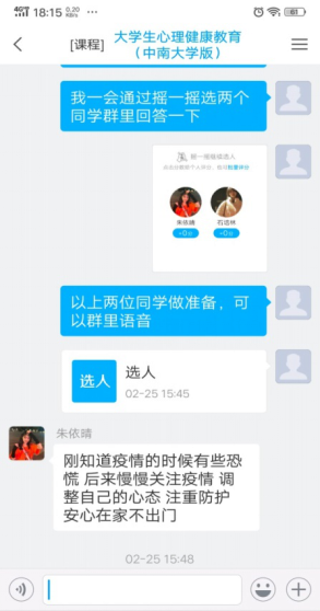 疫情防控期间,大学生心理健康教育课程组迅速行动,集思广益,创新课堂教学新模式。根据学校和学院的要求及时调整课程教学方案,组织开展线上教学,并将此次疫情作为线上课堂教学的素材,促进学生与灾难共成长,增强心灵韧性。