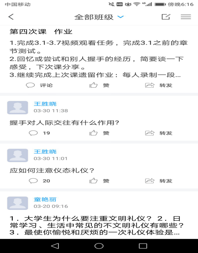 行为能力养成课程于2018年建设为校级精品在线开放课程,疫情期间,大学生行为能力养成教学团队在课程负责人王胜晓老师的带领下,齐心协力、献计献策,严格贯彻落实学院“延期开学不停教、不停学”的工作方针,全力准备课程的线上教学工作。线上教学正式开课前,在课程负责人的牵头下,课程团队利用QQ、微信等沟通平台,统一思想,安排线上教学计划,部署线上教学具体措施。在课程开课前完成了制订线上教学计划进度,完善已搭建好的学习通课程平台,导入本学期课程开设的64个教学班(含合班)3700余名学生信息,完成教师教学班级的分配等任务,同时,团队成员充分发挥了互相协作,以老带新的工作作风,教学团队中的老教师指导新进教师熟悉课程、熟悉学习通教学平台的操作等,确保团队中每一位教师都能高质量完成课程的教学任务。