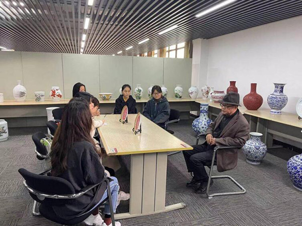 许挺教授与学生亲切交流 在展出过程中,20 19级小学教育专业学生的书法作品得到了许挺教授的赞许,许教授邀请她们到工作室交流,并对她们的书写进行指导。对学生进行指导的过程中,许挺教授以他在景德镇多年的学习和创作为例,为同学们分享学习书法的经验,分门别类为学生讲述创作历程,并留下了学生的联系方式,以便后续指导学生的书画学习。