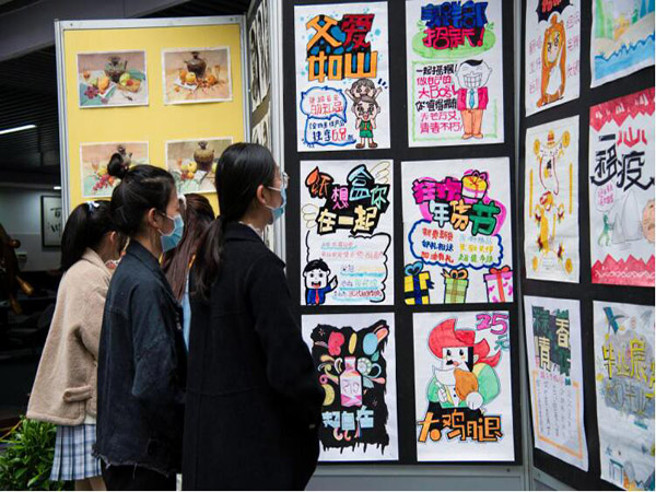 学生驻足观看作品 本次展出的作品以现代教育学院各专业美术课程中学生的课堂作业为主,题材丰富,形式多样。作品种类有黑板报、手抄报、手绘POP海报、剪纸、诗文配画、硬笔书法、软笔书法、素描和水粉作品等,展现了学院学生的创意思维和个性风采。在作品展览期间,吸引众多师生驻足欣赏、交流。