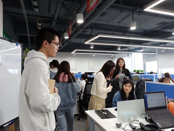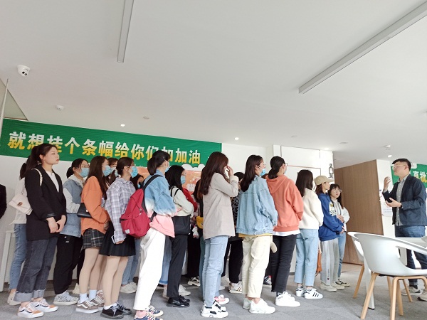 参观现场 活动中,学生们有序参观了公司的办公室、休息区、文化墙等,直观了解了公司的工作环境和企业文化。接着,双方在公司会议室进行了座谈,郑财校招负责人李乐生动介绍了在线教育行业的历史和现状、好未来教育集团以及学而思网校的基本情况、初中英语网课教师的岗位要求等;郑州区域校企负责人黄禹铭就学生们有关薪资待遇、实习安排、工作时长、面试要求等问题一一作出解答;座谈会最后,黄禹铭老师组织学生们加入了实习班级“当康班”,并就班级今后的任务进行了规划讲解,经过自愿竞选,两个实习班级各选出2名组长,组长将负责后期班级的作业收集、联络通讯等工作。整场座谈交流中,学而思网校负责人热情洋溢,学生们也互动积极。 本次活动使学生们了解了在线教育行业的工作现状,提供了实习提升的平台,促进了校企双方多层次多领域的合作,为下一步的交流奠定了良好基础。 |