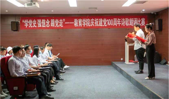 为庆祝中国共产党成立100周年,深入贯彻党史学习教育动员大会精神,在青年学生中深入开展“学党史、强信念、跟党走”系列活动,激发爱党爱国情怀,鼓励青年学生为实现“两个一百年”奋斗目标、实现中华民族伟大复兴的中国梦贡献青春智慧和力量。5月8日中午,教育学院于图书馆502视听室举办“学党史、强信念、跟党走”庆祝建党100周年诗歌朗诵比赛。院党总支书记丁青山、副书记曹亮、副院长郑琳娜、团总支书记胡亚东、全体辅导员以及部分师生代表参加了此次比赛。