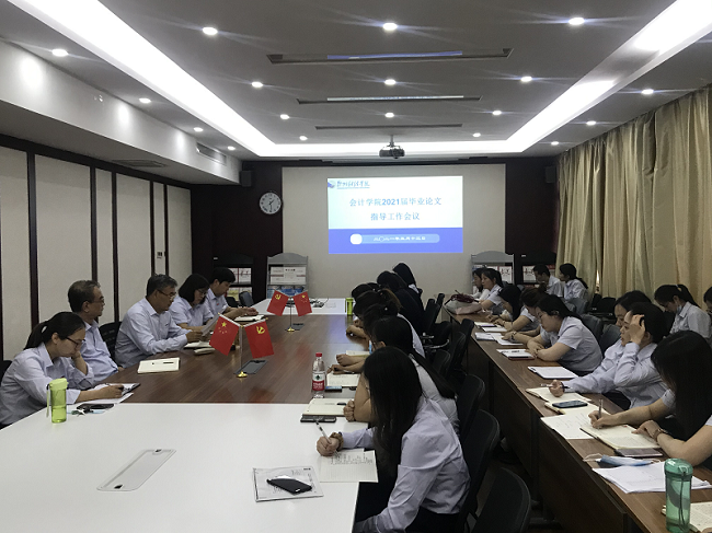 毕业论文是确保本科教学质量的关键环节,5月13日,会计学院在行政楼C楼308会议室召开了2021届本科毕业论文指导工作专题会议,会计学院院长张学功、副书记王宇,管洲教授、许玲玲博士及各论文指导组负责人参加了会议。
