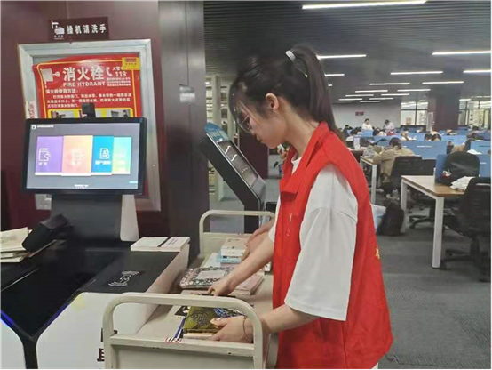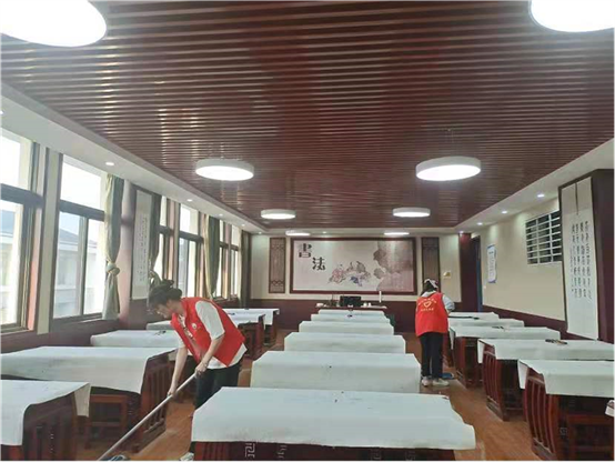 志愿者在图书馆整理摆放书籍。学院志愿者们分成小组,有序配合,整理书籍。一部分志愿者负责将书籍归位,一部分志愿者负责检查书籍顺序。一番劳动,大家的手上虽然布满灰尘,但心中却充满奉献后的暖意。随后,志愿者对学院教学楼的书法和钢琴教室展开了清扫活动。志愿者分工合作,互帮互助,仔细清扫教室的每个角落。
