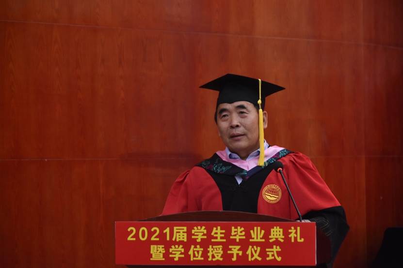 院长冀延卿教授致辞。首先他向毕业生表达祝贺,在即将踏上人生新征程之际,从终身学习,奋斗和机遇,初入职场的注意事项,把好人生之舵、走好人生路,热爱生活、激扬人生五个方面寄语广大毕业生,期望同学们用自己的奋斗和汗水把精彩纷呈的人生篇章,书写在共和国新时代的大地上,书写在社会主义现代化强国的大厦上。