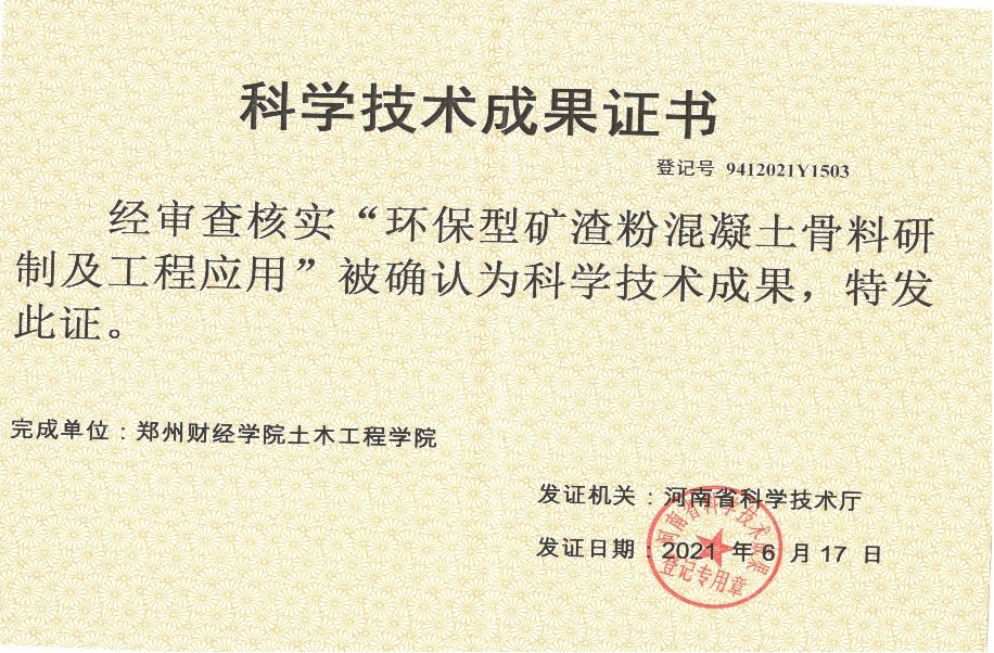2021年6月,土木工程学院与郑州赛诺建材有限公司合作项目“环保型矿渣粉混凝土骨料研制及工程应用”和“土壤成岩剂的研制及工程应用”,分别通过河南省科学技术厅的验收审核,并取得科学技术成果证书。