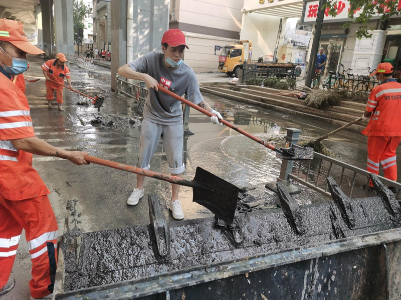智能工程学院20级车辆工程专升本1班张汉哲帮助清理道路淤泥