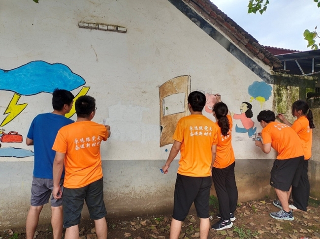 墙绘妙笔生花,情系美丽乡村。经过与窗户台村村委会的商讨,指导老师前往该村各个位置进行了实地勘察,最终确定了主题墙绘的位置。实践团队员在老师的带领下,顶着炎炎烈日,从构图起形、调色到涂色,成员之间相互合作、配合默契,每幅图画都倾注了实践团全体队员的心血。经过细致的涂绘,单调的白墙变得画面饱满、立体丰富、雅韵翩然,为该村营造浓厚的反邪教氛围增添了绚丽的一笔,同时吸引了很多村民驻足观看,小朋友们也前来观看学习。