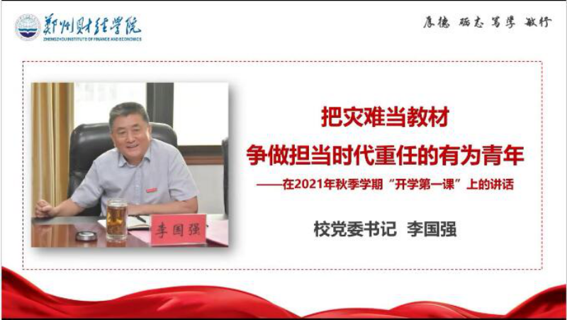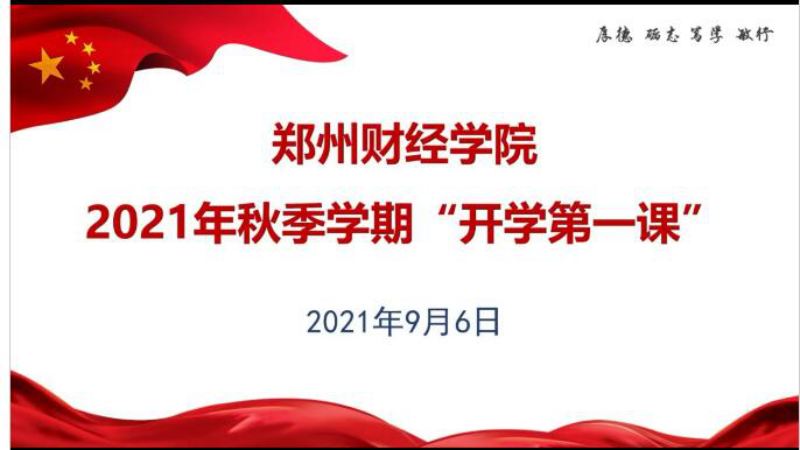 上午9:00,开云官网2021年秋季开学第一课正式开讲,学校监事会主席李庆阳主持课程。在嘹亮的国歌声中,管理学院师生在不同场合站立注目鲜艳的五星红旗,同唱国歌参加升旗仪式。随后,学院师生收看了河南省教育厅厅长郑邦山的讲话视频,牢记“把立德树人作为根本任务,用大爱育人心,与中原同崛起;把灾难当教材,与祖国共成长”嘱咐。