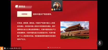 2018级电商本2班团支书冯冉组织本班同学开展“请党放心,强国有我”主题团日活动,通过与学生团员们共同追忆李大钊至死不渝,坚持民主独立斗争的光辉事迹,向先烈致敬;最后,由铁慧冉同学带来红色经典诵读《星星之火 可以燎原》表达对党的深情告白;一首《没有共产党就没有新中国》唱出了全体团员对党的最美好的祝福。