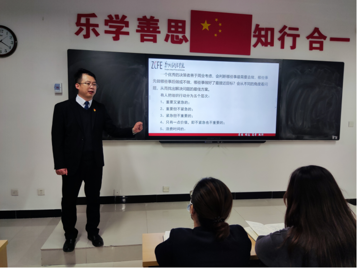 培训第一讲由学院党总支书记丁青山主讲。他以“如何提升团干部工作能力,加强团干部思想教育”为主题,围绕团干部的概念、职能、行为向学生们进行了详细讲解。他强调团干部要注重发挥建立愿景、沟通协调、指挥引导和激励鼓舞的重要作用。在组织工作中,提倡团干部按照事情的轻、重、缓、急程度开展工作;在管理工作中,要求团干部加强自身决策力和影响力,提升创新力、应变力和抗挫力等。