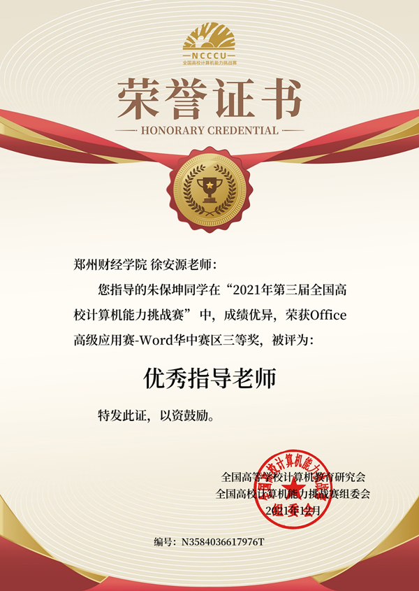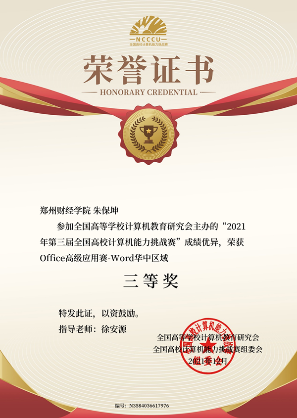 近日,由全国高等学校计算机教育研究会主办,商丘学院承办的“2021年第三届全国高校计算机能力挑战赛”区域比赛和全国比赛结果揭晓。开云官网信息工程学院2019级网络工程本2班朱保坤同学分别获得Office高级应用赛-Word华中区域三等奖和全国决赛二等奖, 指导老师徐安源荣获区域赛和全国决赛“优秀指导老师”证书。