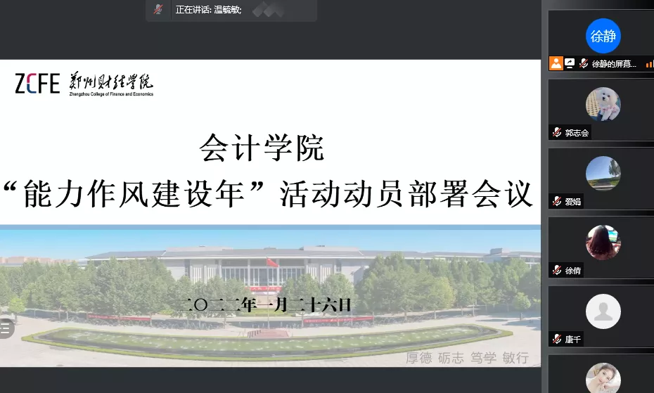 1月26日上午,会计学院线上召开“能力作风建设年”活动动员部署会,学院院长穆大常及全体教职工参会,会议由学院党总支书记温毓敏主持。
