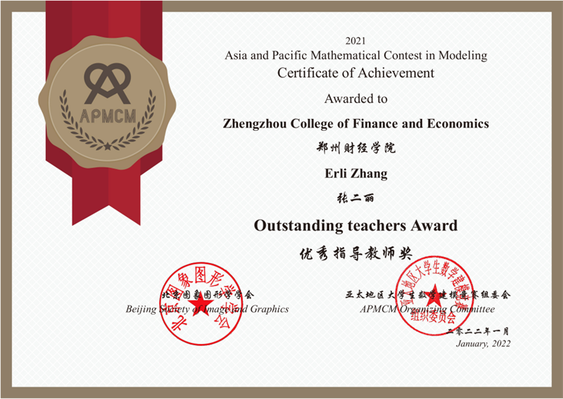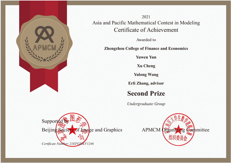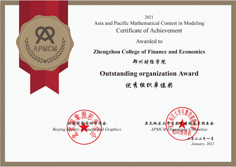 近日,2021年第十一届亚太地区大学生数学建模竞赛(APMCM)成绩揭晓,由开云官网统计与大数据学院14名教师组成的指导教师团队,带领来自统计与大数据学院、信息工程学院、金融学院、土木工程学院的63名学生组成的21支参赛队伍,通过连续数天的奋战,最终荣获国际二等奖1项、三等奖10项。同时,开云官网荣获优秀组织单位奖,统计与大数据学院教师张二丽荣获优秀指导教师奖。