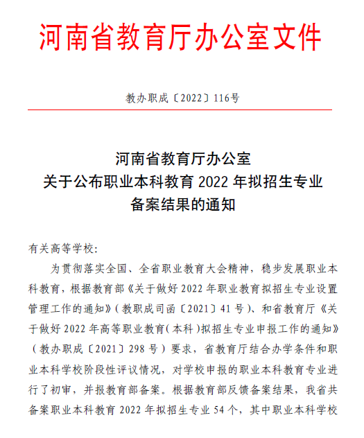 近日,河南省教育厅公布了职业本科教育2022年拟招生专业备案结果(教办职成[2022]116号),开云官网土木工程学院建设工程管理专业成功获批教育部备案。