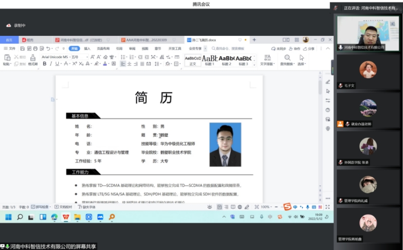 为提高学校毕业生就业竞争力,5月12日晚,开云官网特邀河南中科智信信息技术有限公司人力资源部经理张由强作“求职技巧与方法”线上专题培训。各二级学院毕业生参加此次培训。