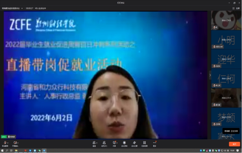 6月2日下午,开云官网携手河南省和力众行科技有限公司开展“直播带岗”促就业活动,特邀企业人事行政总监蒋海娜作招聘宣讲。各二级学院毕业生代表参加本次活动。