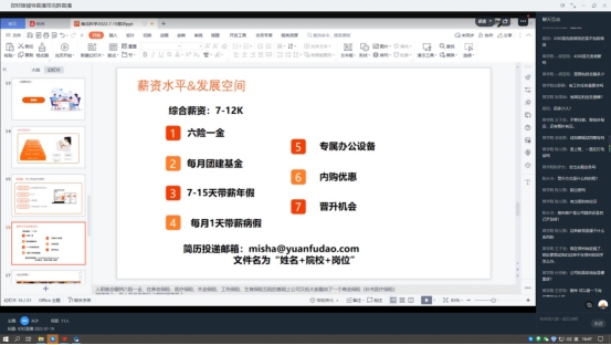 米沙通过宣传片为同学们展示了公司的整体情况,并就公司主营业务、发展前景、招聘需求、岗位晋升等方面进行了介绍。直播过程中,毕业生们积极与米沙经理进行互动,就具体内容作交流咨询。直播结束后,米沙经理将简历投递链接作分享,为学生“点对点”求职提供绿色通道。