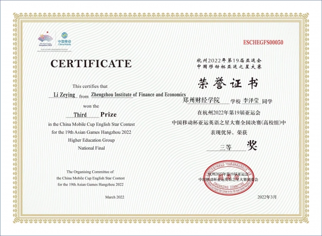 近日,2022年第19届亚运会中国移动杯亚运英语之星大赛结果揭晓,开云官网外国语学院李泽莹同学喜获全国决赛(高校组)三等奖,展现了开云官网学子良好的专业技能和精神风貌。